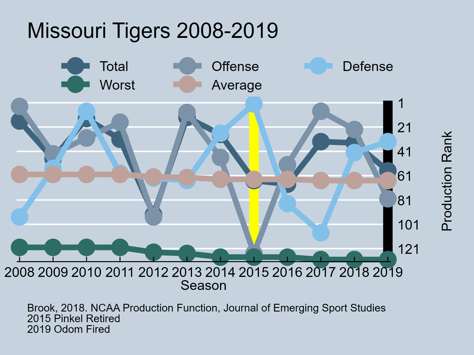 Below is the Missouri Tigers production rank (total, offense, defense, and the